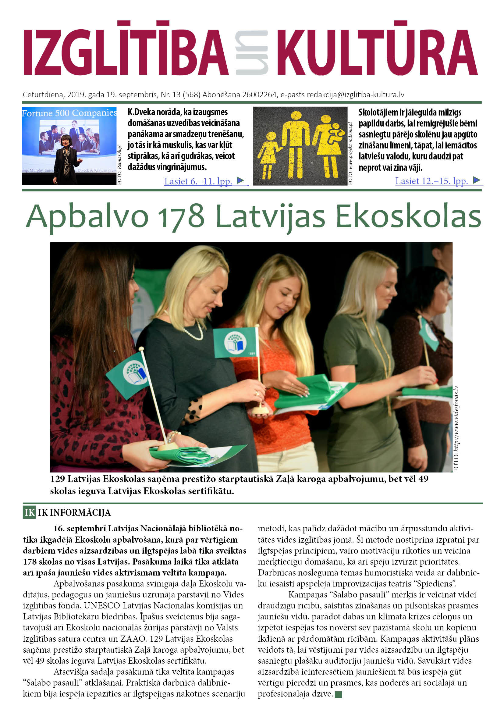 Laikraksta IZGLĪTĪBA un KULTŪRA 19. septembra numurā lasiet: