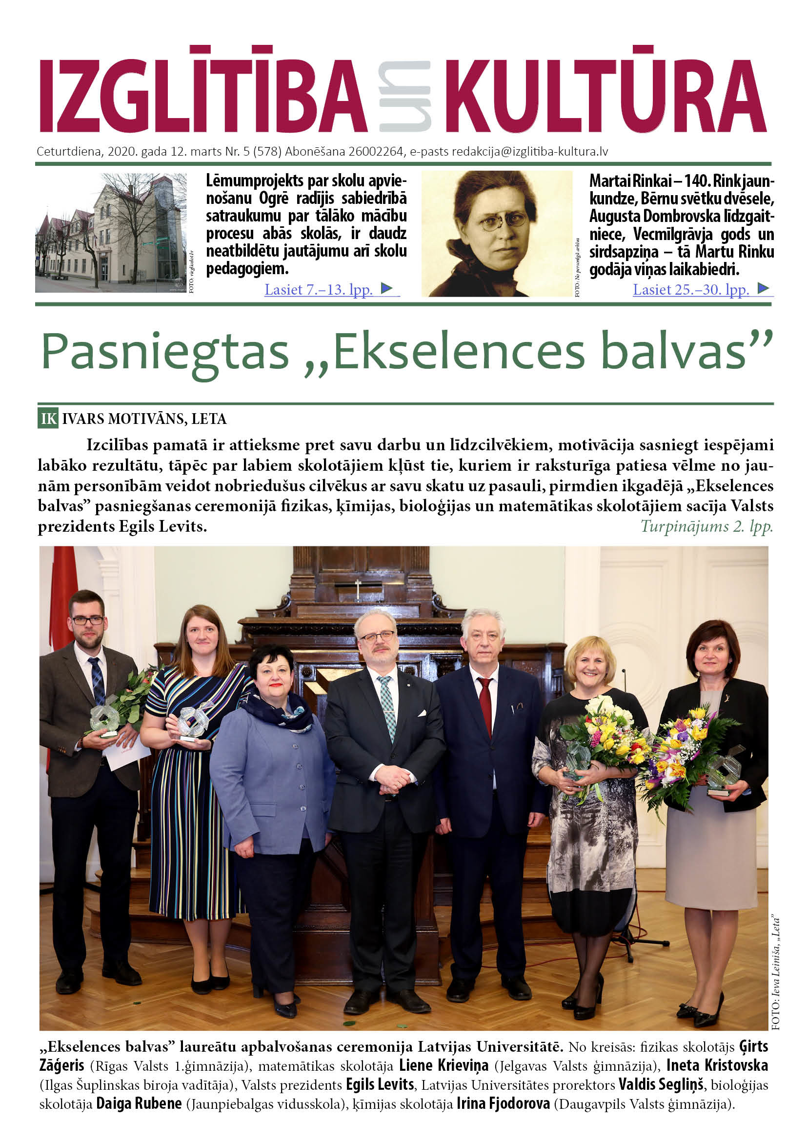 E-laikraksta IZGLĪTĪBA un KULTŪRA 12. marta numurā lasiet:
