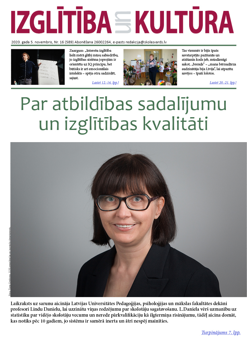 Par atbildības sadalījumu un izglītības kvalitāti. Laikraksts uz sarunu aicināja Latvijas Universitātes Pedagoģijas, psiholoģijas un mākslas fakultātes dekāni profesori Lindu Danielu, lai uzzinātu viņas redzējumu par skolotāju sagatavošanu. L.Daniela vērš uzmanību uz statistiku par vidējo skolotāju vecumu un neredz pārkvalifikāciju kā ilgtermiņa risinājumu, tādēļ aicina domāt, kas notiks pēc 10 gadiem, jo sistēma ir samērā inerta un ātri nespēj mainīties.