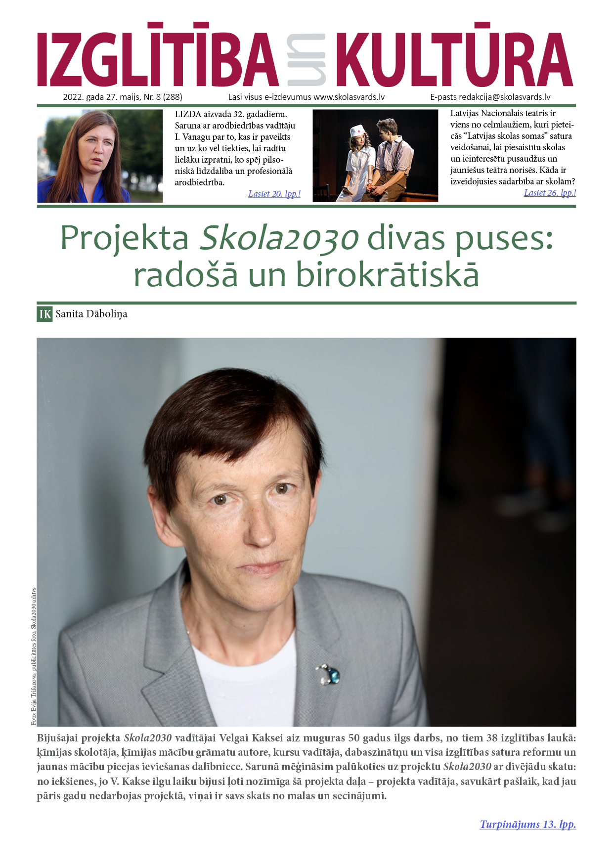 Projekta Skola2030 divas puses: radošā un birokrātiskā. Bijušajai projekta Skola2030 vadītājai Velgai Kaksei aiz muguras 50 gadus ilgs darbs, no tiem 38 izglītības laukā: ķīmijas skolotāja, ķīmijas mācību grāmatu autore, kursu vadītāja, dabaszinātņu un visa izglītības satura reformu un jaunas mācību pieejas ieviešanas dalībniece. Sarunā mēģināsim palūkoties uz projektu Skola2030 ar divējādu skatu: no iekšienes, jo V. Kakse ilgu laiku bijusi ļoti nozīmīga šā projekta daļa – projekta vadītāja, savukārt pašlaik, kad jau pāris gadu nedarbojas projektā, viņai ir savs skats no malas un secinājumi.